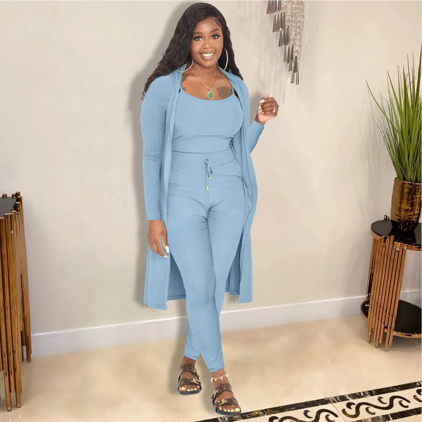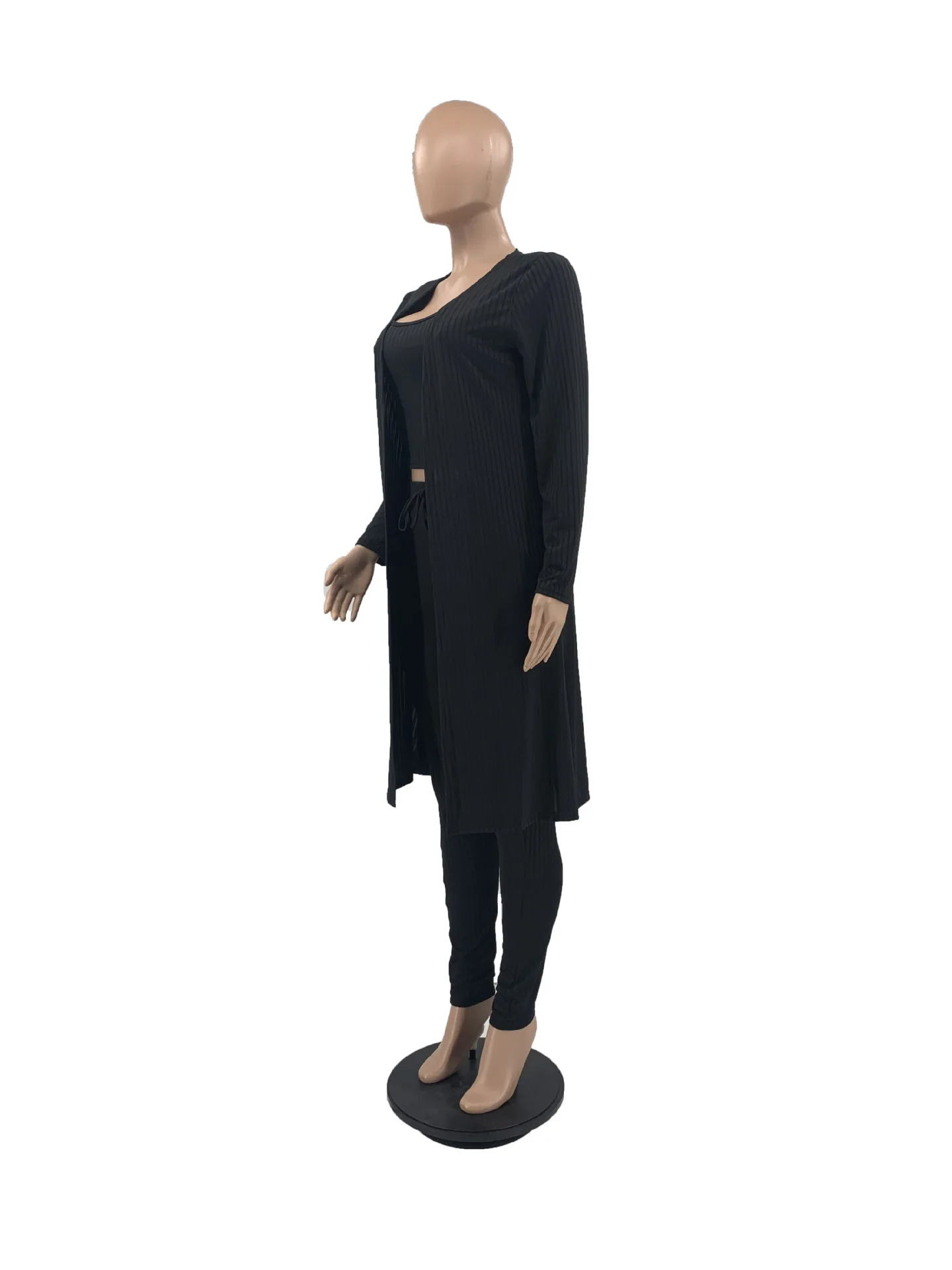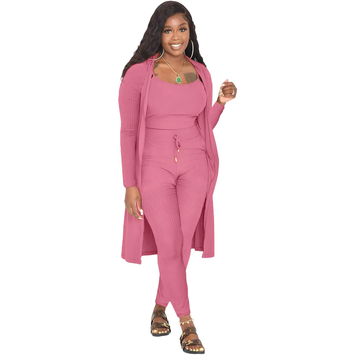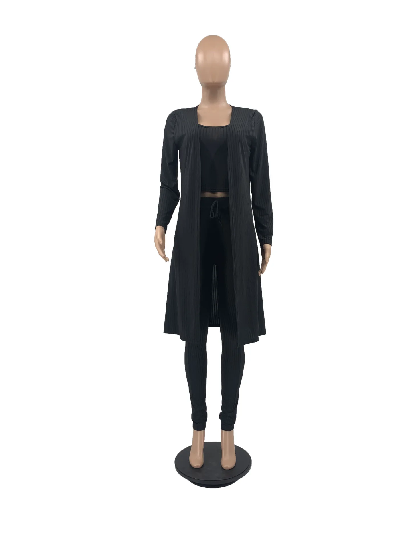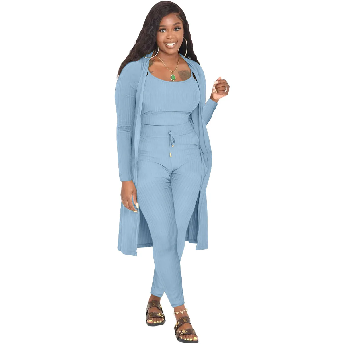 3 Pieces Color Women Crop Top Long Pants Cardigans Set