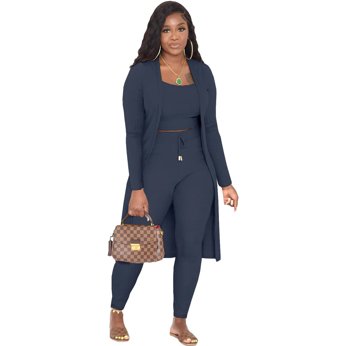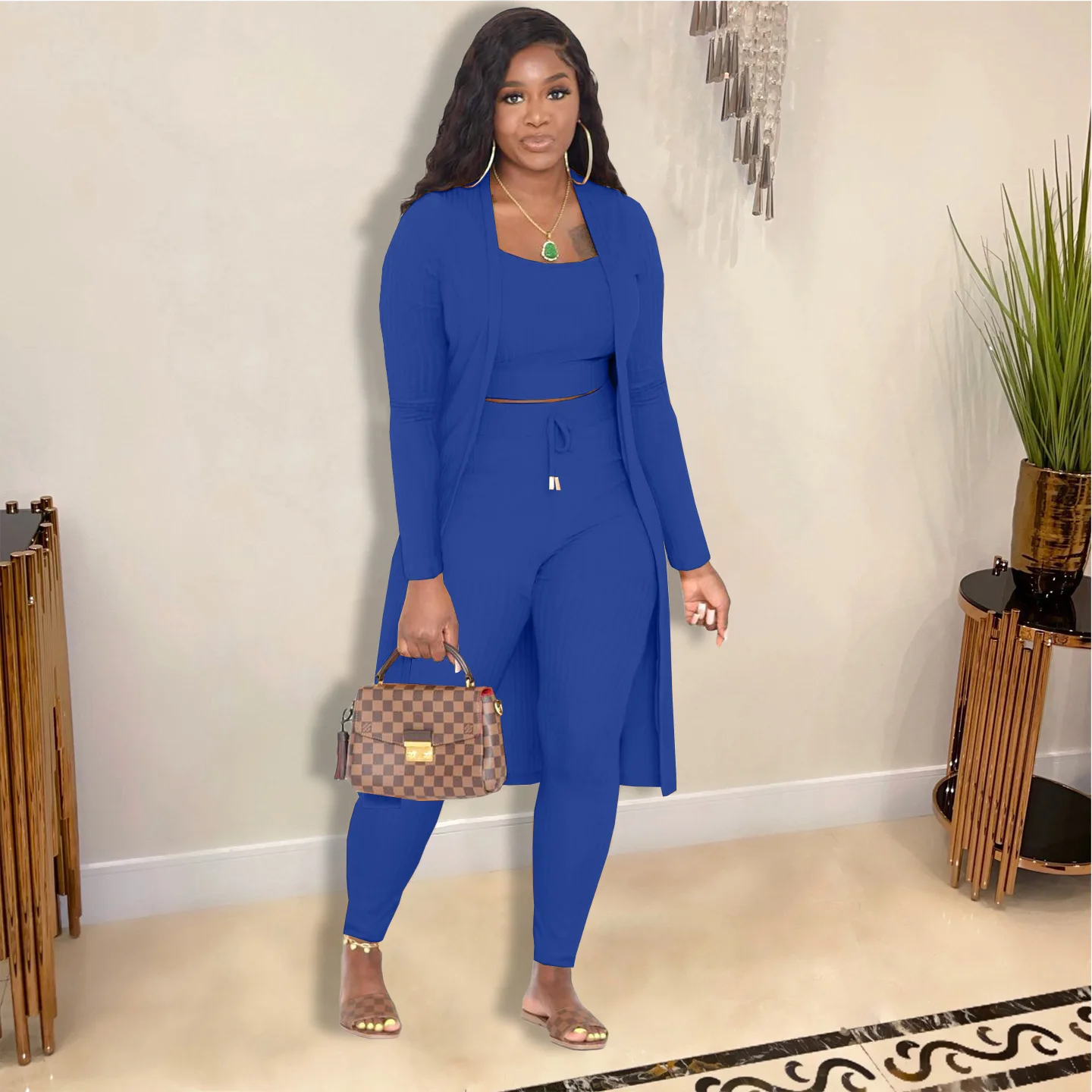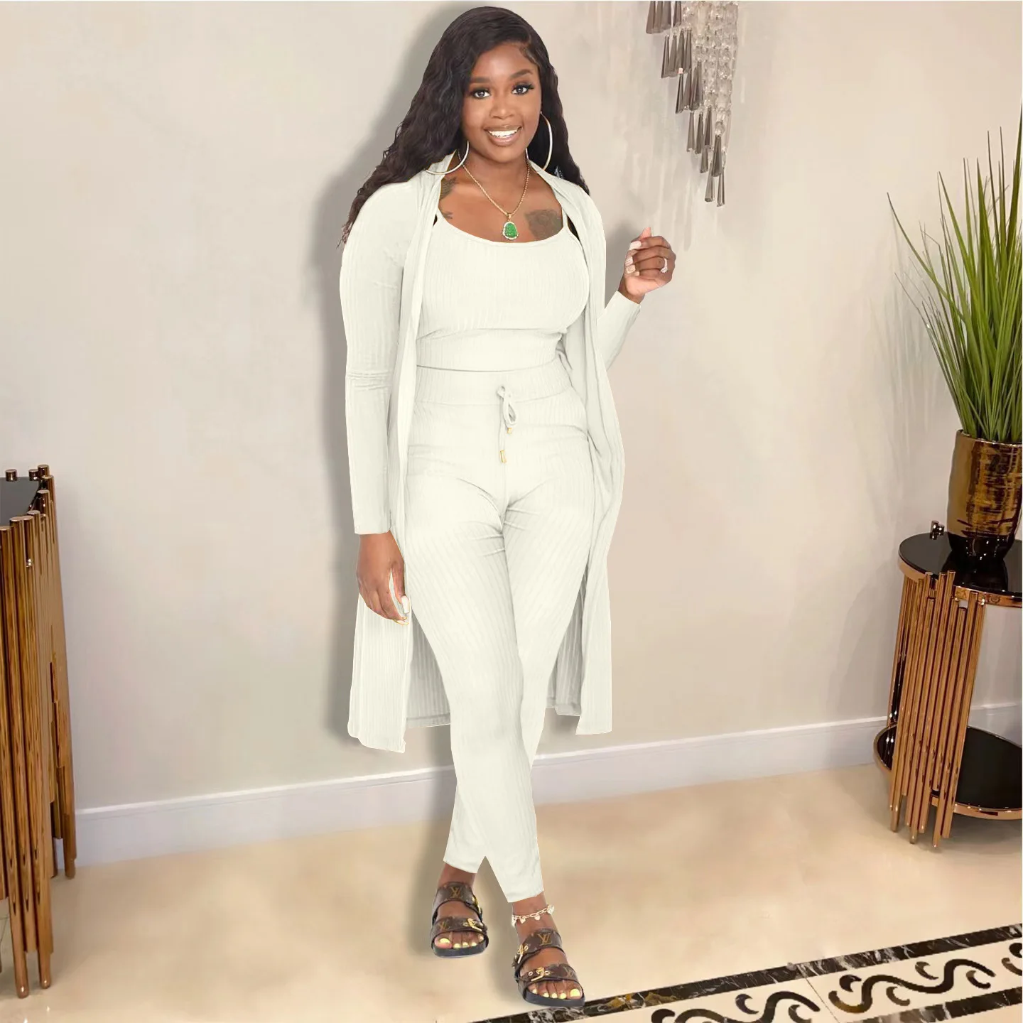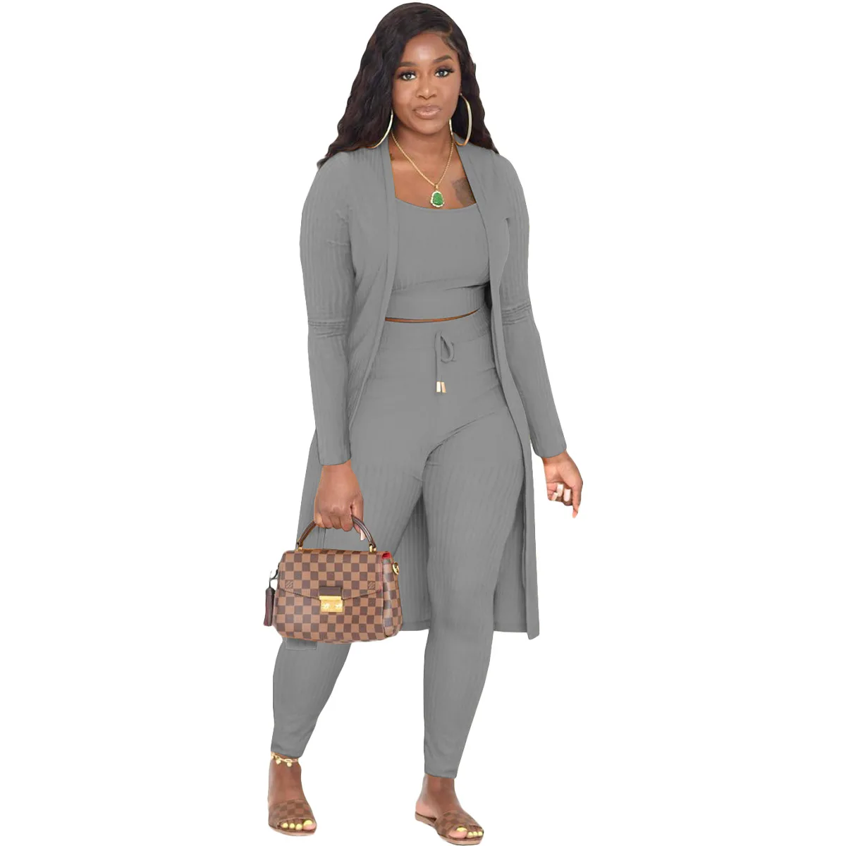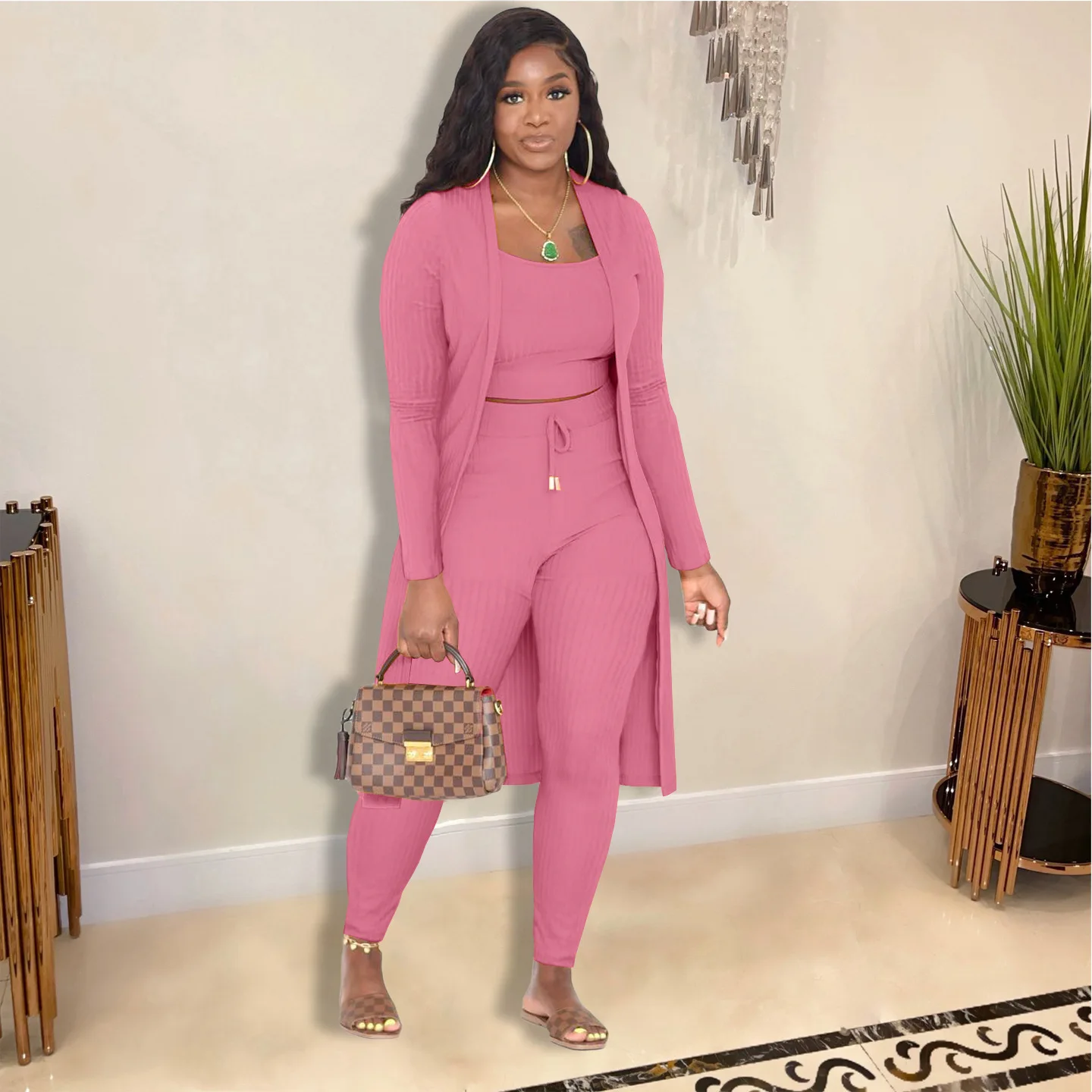 3 Pieces Color Women Crop Top Long Pants Cardigans Set