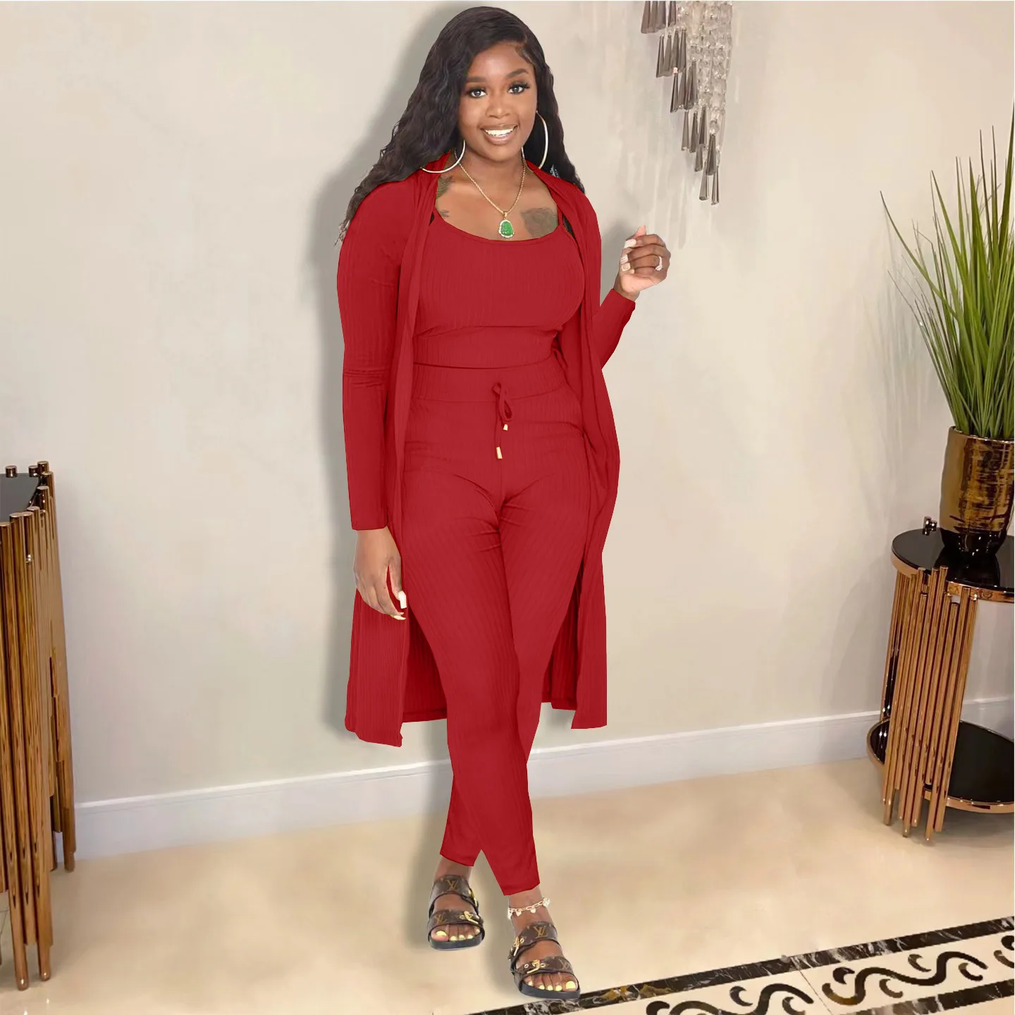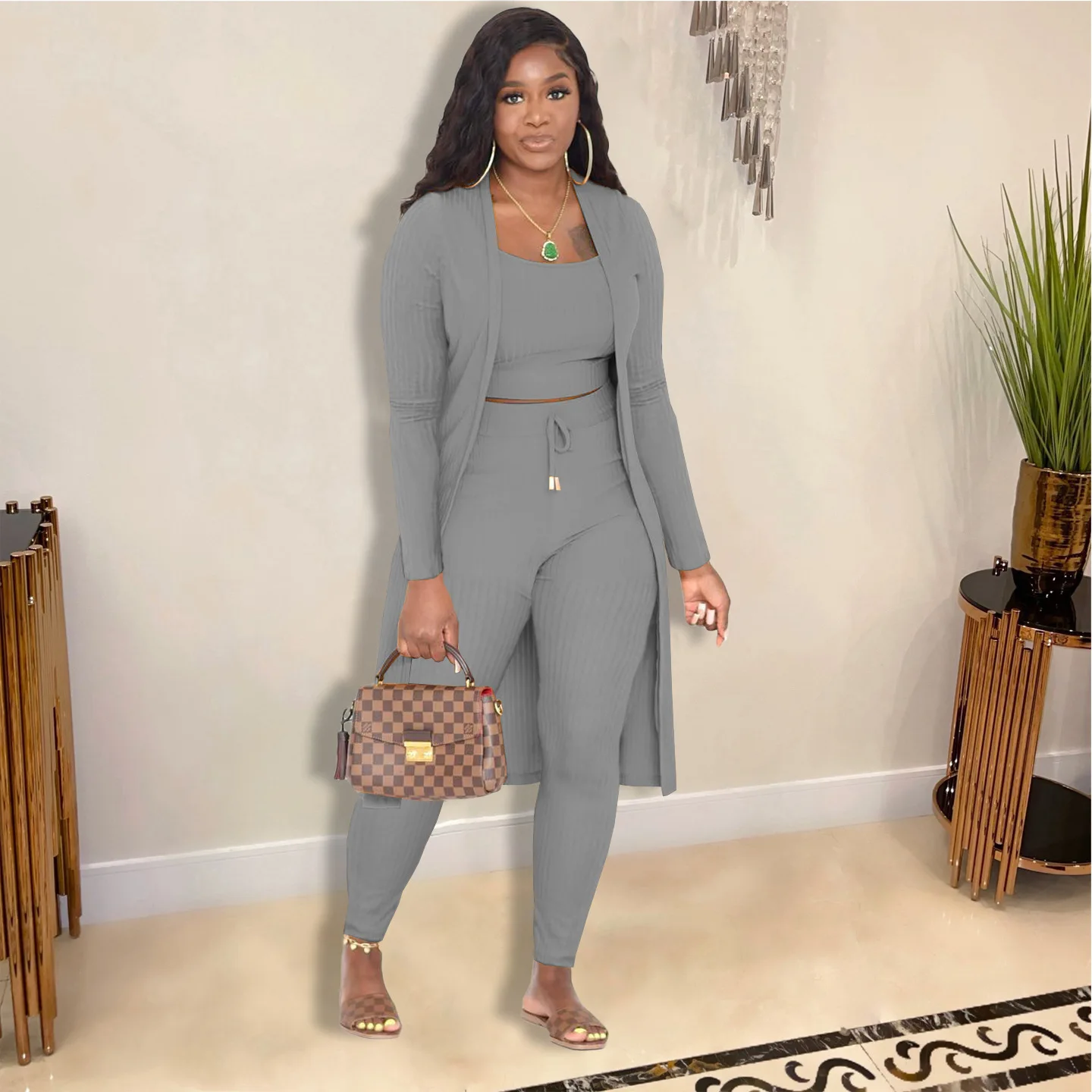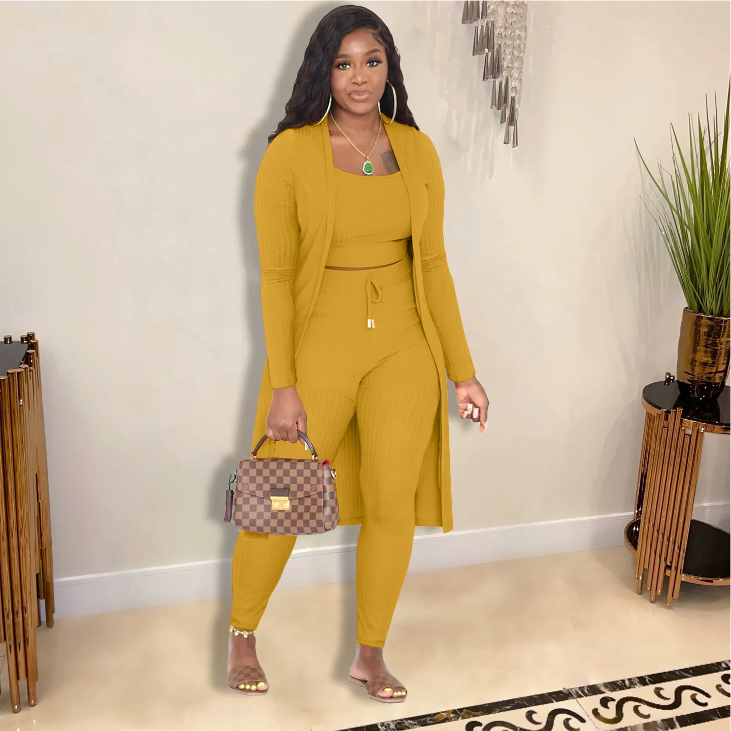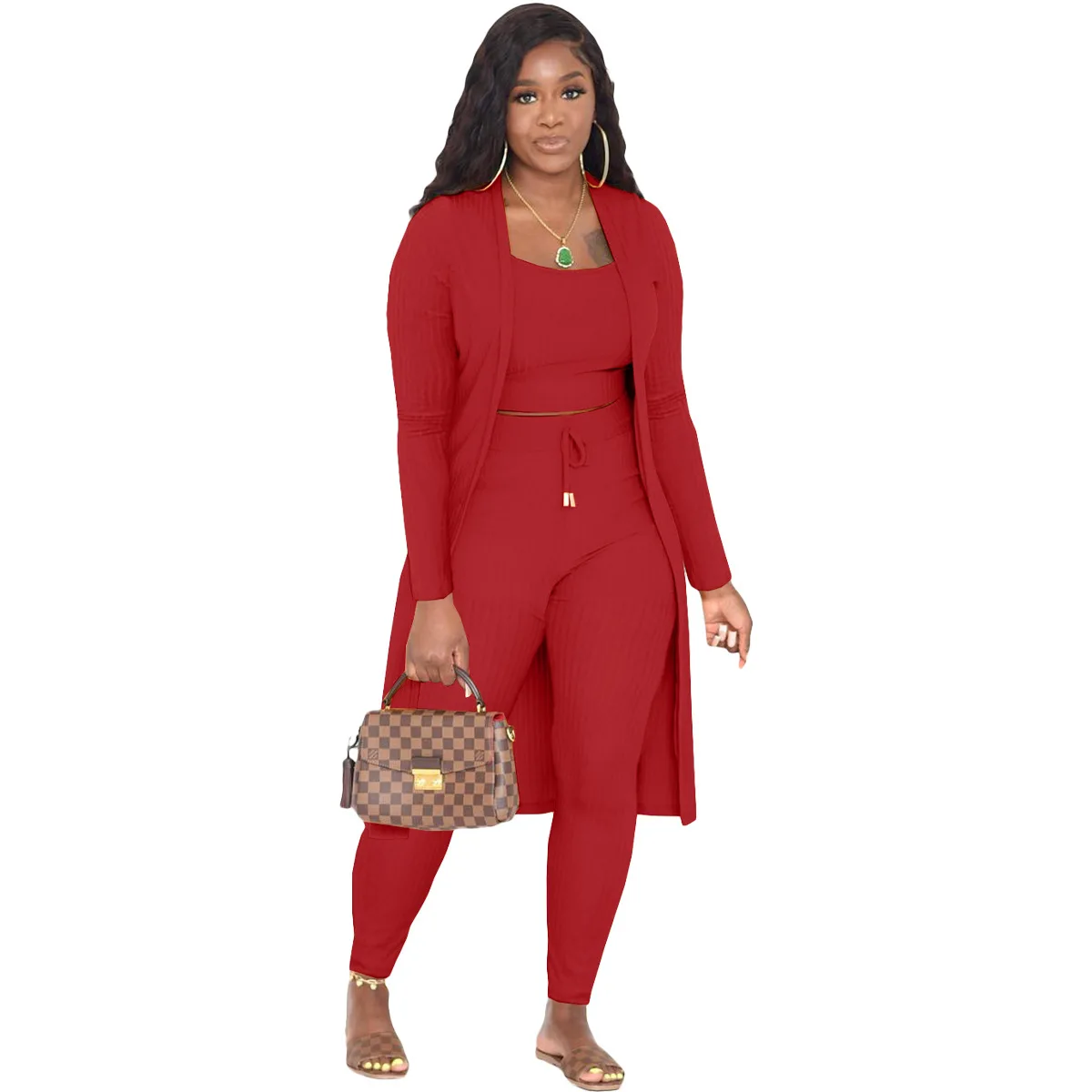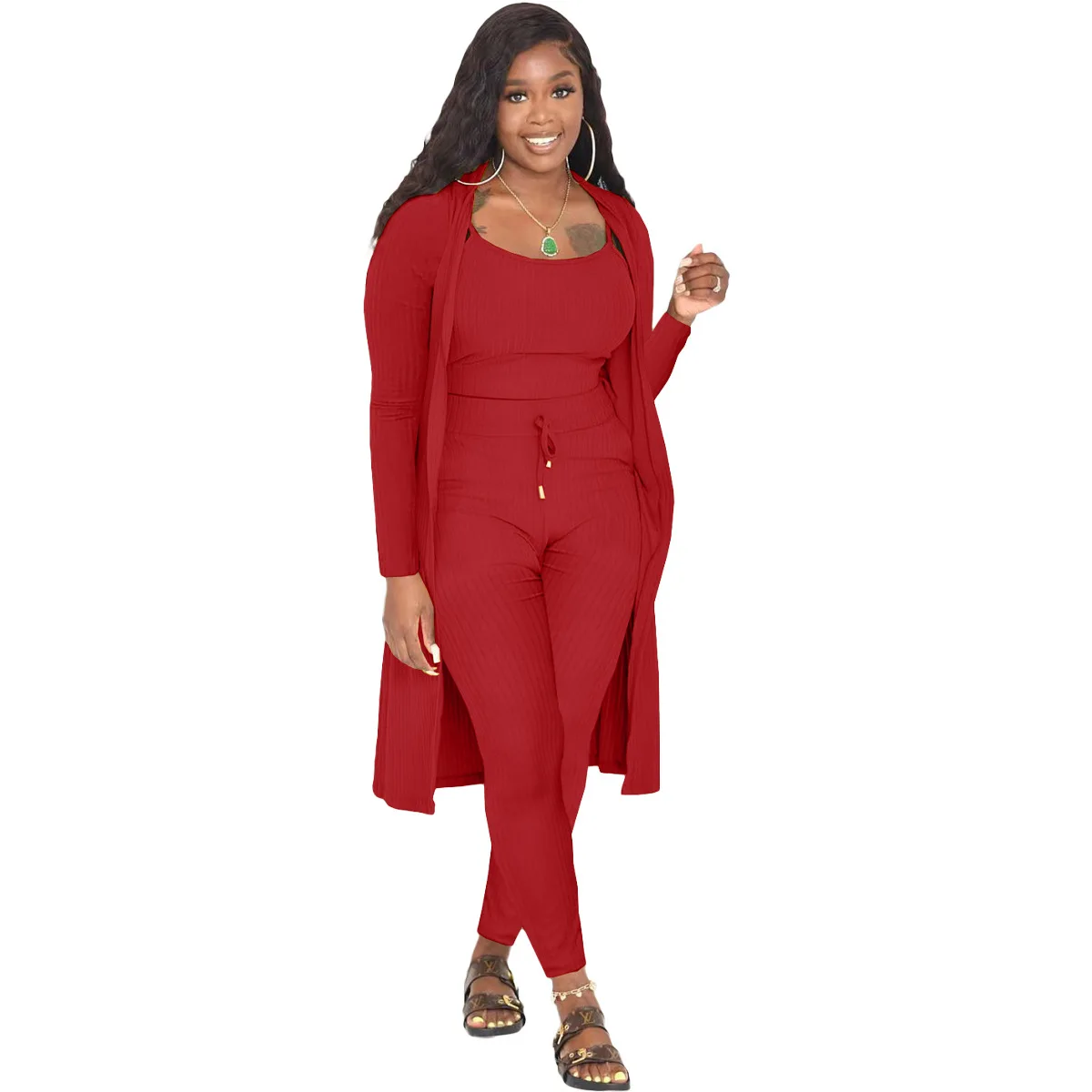 3 Pieces Color Women Crop Top Long Pants Cardigans Set
