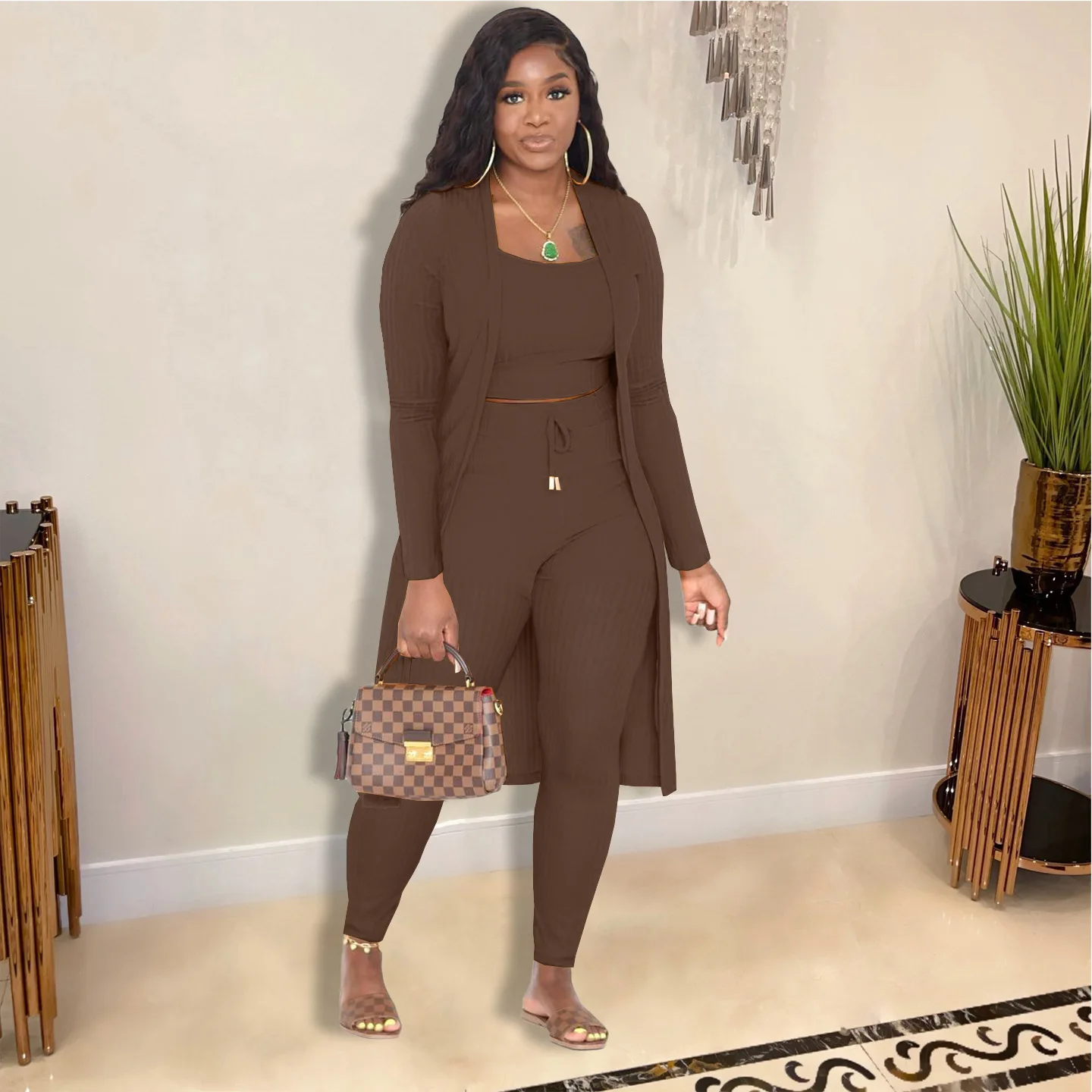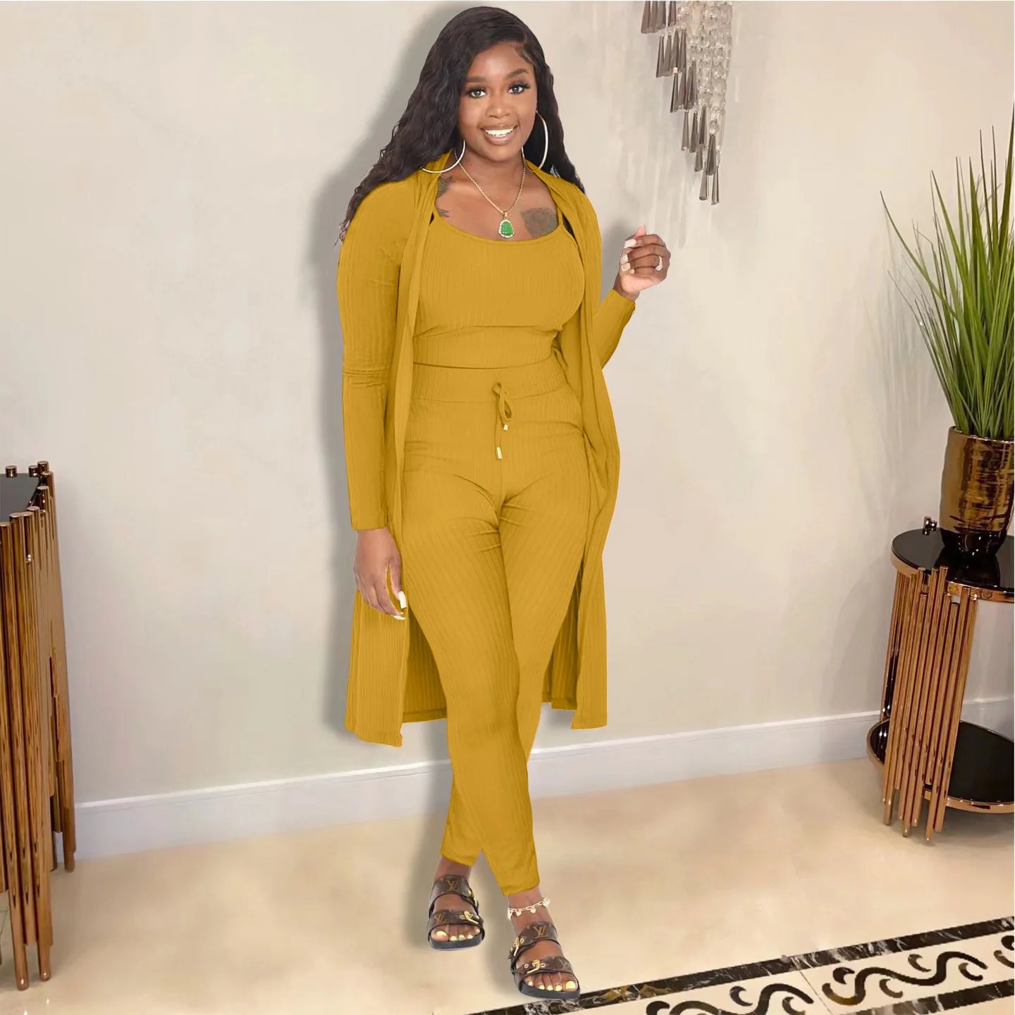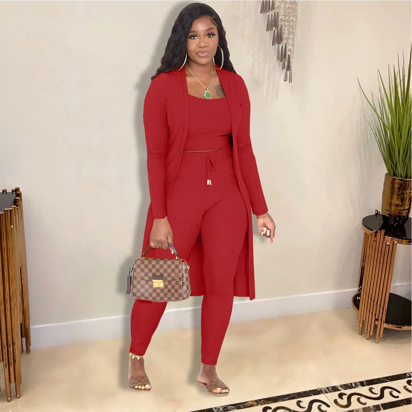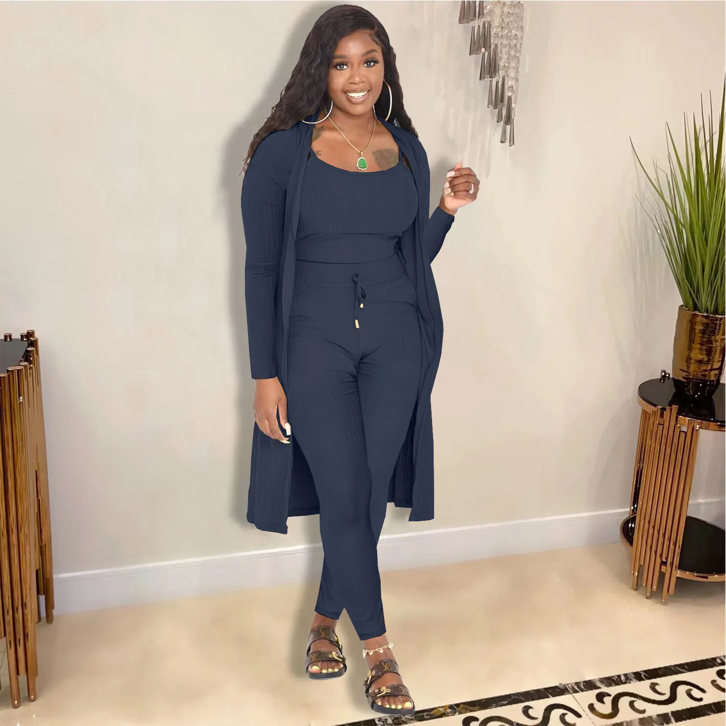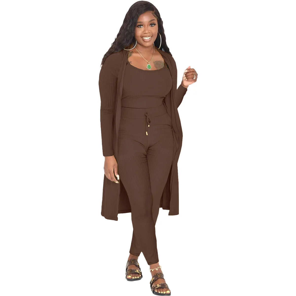 3 Pieces Color Women Crop Top Long Pants Cardigans Set