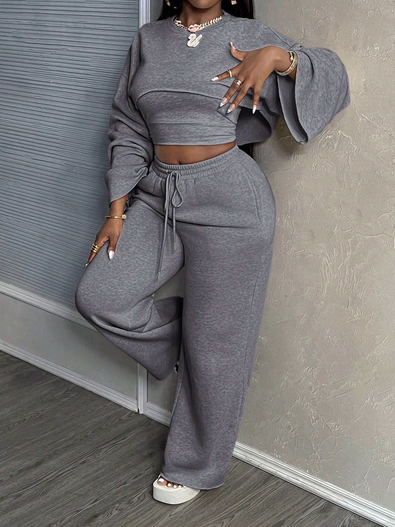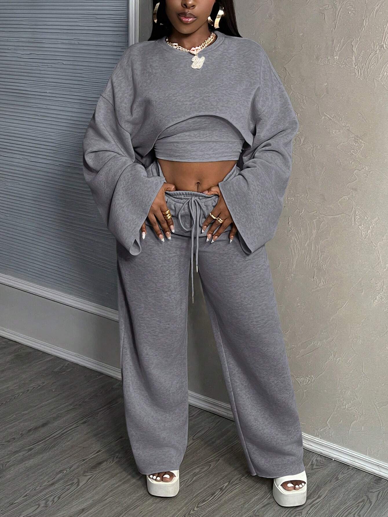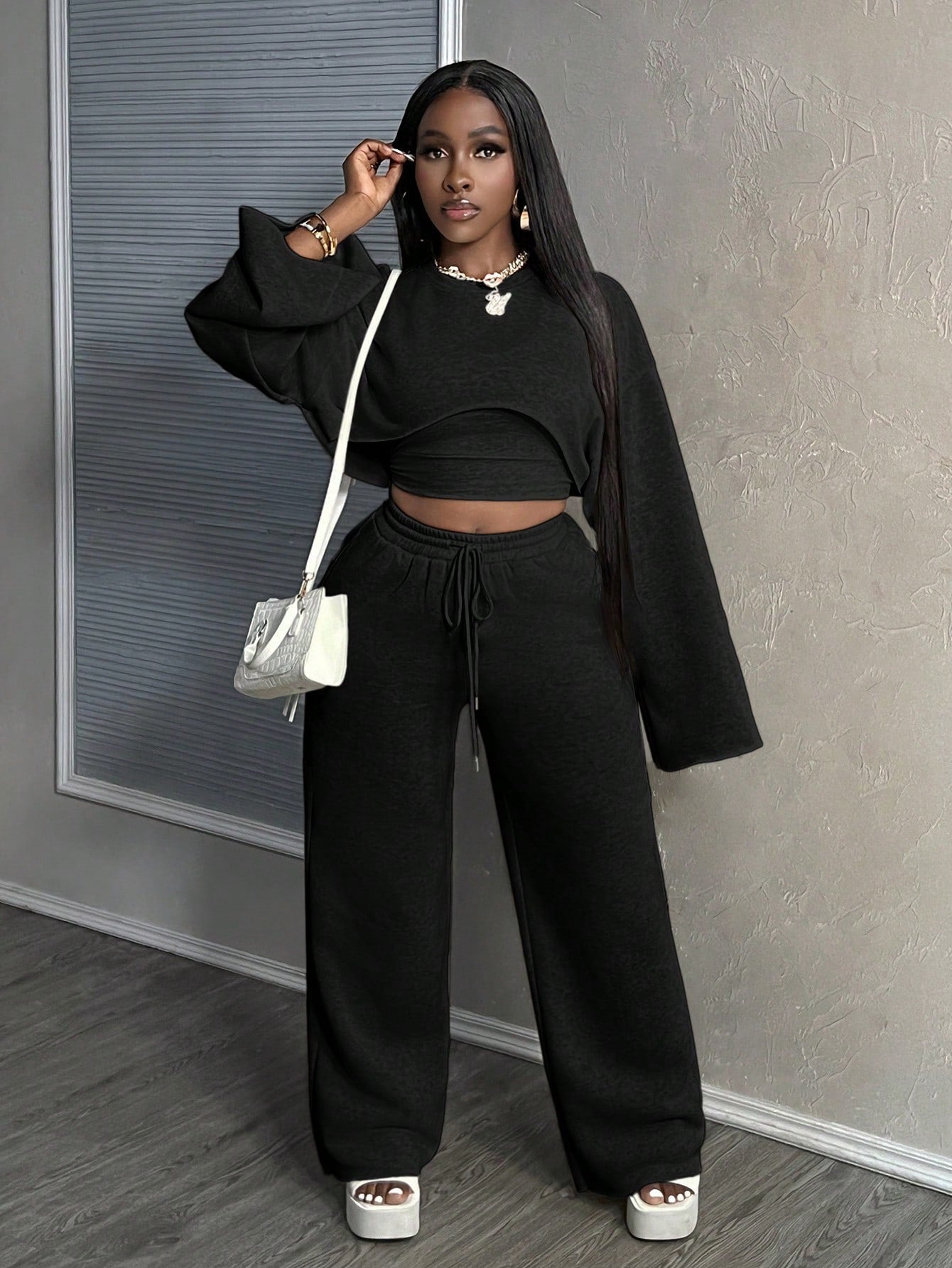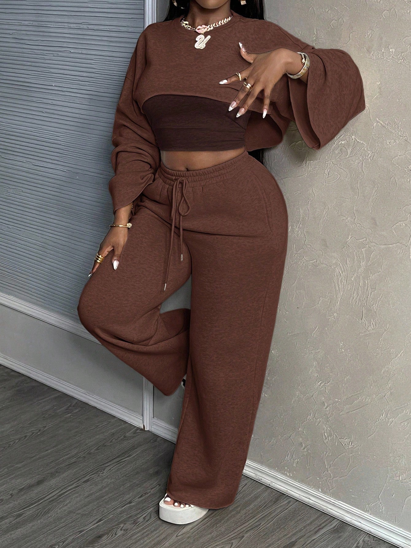 Long Sleeve Cropped Top, Cami, And Wide Leg Pants Set